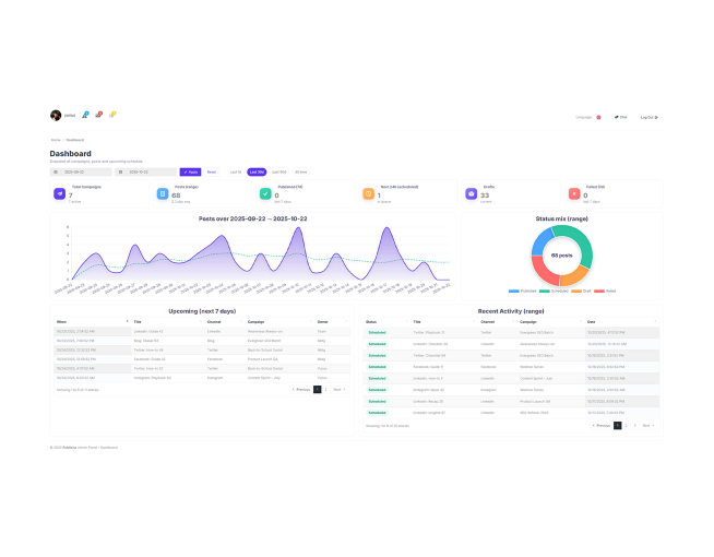 Publisha has a built-in smart scheduler that lets you set the first publish date, choose the frequency (e.g., minutes, hours, days), and define end conditions. Once set, your content is published automatically to selected platforms without manual posting.